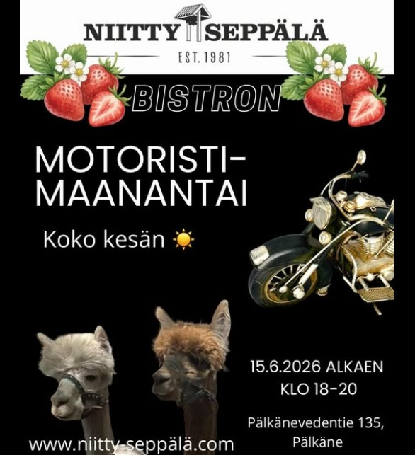 Niitty-Seppälän Bistro aloittaa motoristi maanantait, käydään tutustumassa. “Motoristit tervetuloa kahville, tilaburgerille ja belgialaiselle vohvelille☕ Kokoonnutaan pyörien kanssa kahvilalle viettämään rentoa iltaa. Parkki täyttyy moottoripyöristä ja kahvi on kuumana.” Kokoonnutaan Mr. Moorella tankit täynnä! Letka starttaa liikkeelle tasan klo 17.00 – ole ajoissa paikalla!